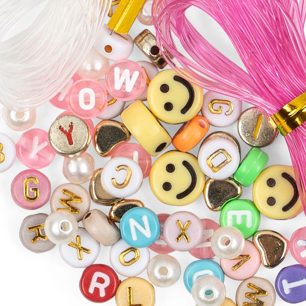Il set per la creazione di gioielli Konges Slojd comprende un cordoncino di nylon trasparente e rosa, 60 perline a forma di lettera e 25 perline a forma di faccina sorridente per aggiungere un tocco divertente e affascinante.