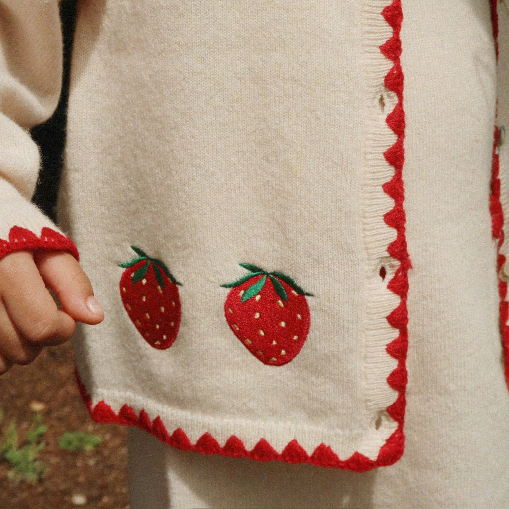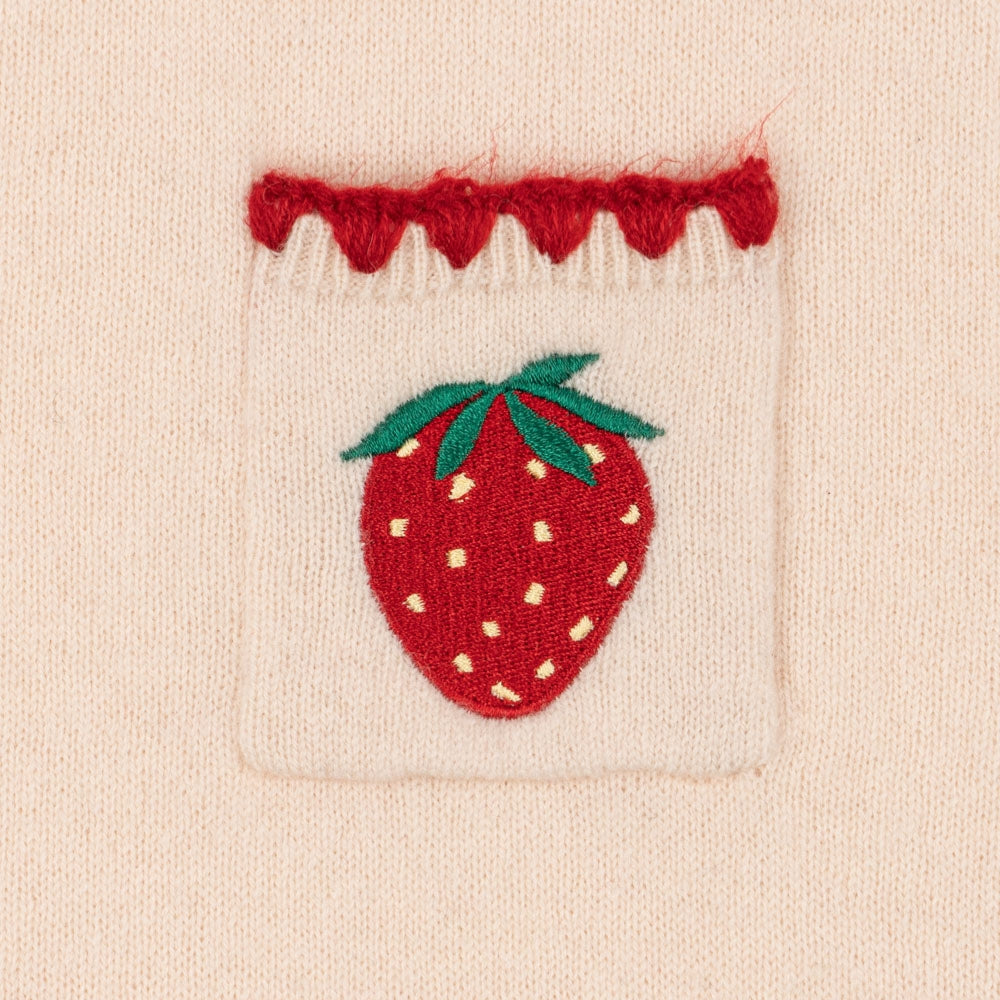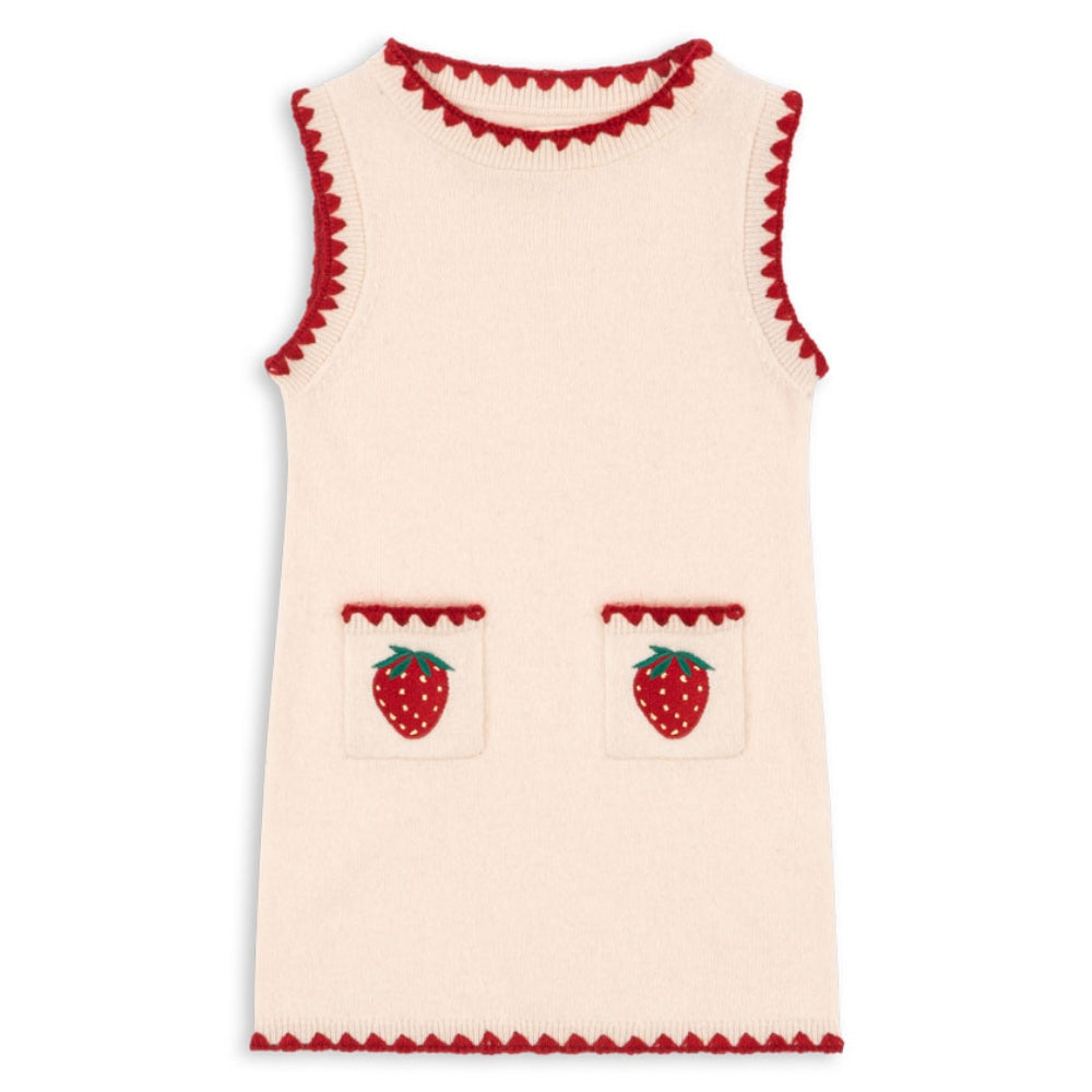 Il sottile ricamo a forma di fragole aggiunge fascino e un tocco unico, mentre la silhouette dritta e leggermente aderente e le pratiche tasche frontali aggiungono funzionalità. L'abito Konges Slojd per bambina è stato progettato pensando all'abbigliamento di tutti i giorni: è caldo, comodo e allo stesso tempo pieno di fascino femminile.