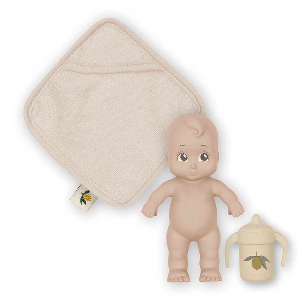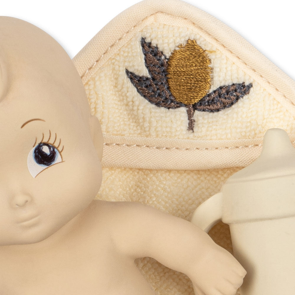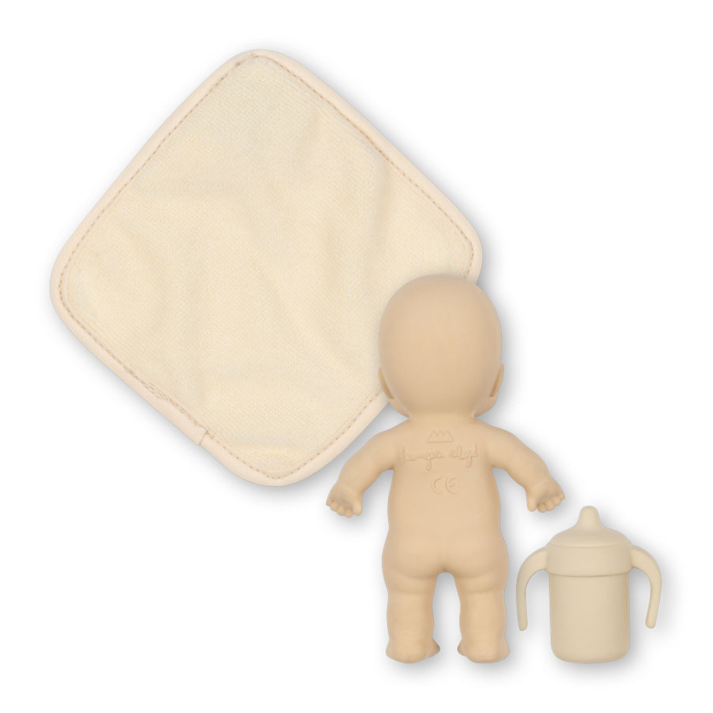 Realizzata al 100% in gomma naturale, questa bambola è morbida al tatto e perfetta per le piccole mani, sono inclusi un mini asciugamano e un biberon.
