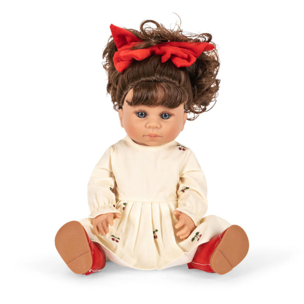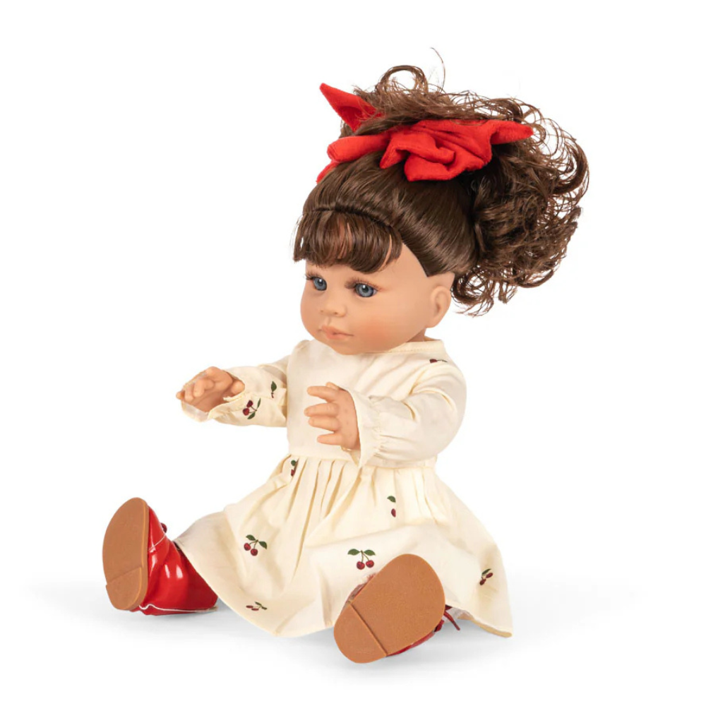 Vestita con un abito con un dolce motivo a ciliegie e dotata di capelli lunghi, incoraggia a creare le proprie storie e i propri rituali quotidiani di toelettatura.