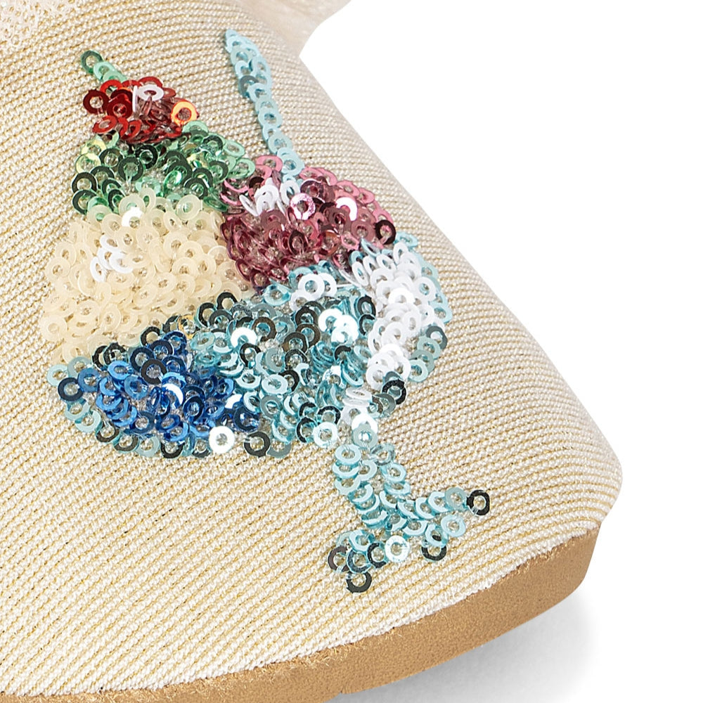 Il modello, con la sua morbida lucentezza e la balza decorativa, si abbina perfettamente allo stile vacanziero, garantendo al contempo comfort e sicurezza ai piedini.