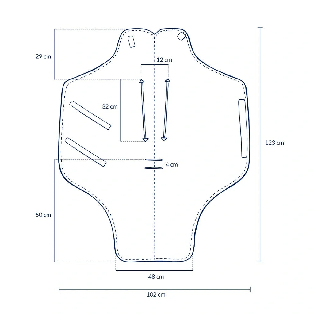 La coperta è dotata di 4 fessure per le cinture, di cui 2 lunghe e laminate, che la rendono adatta alla maggior parte dei seggiolini auto con cinture a 5 punti e a quelli con cinture non retrattili CYBEX.