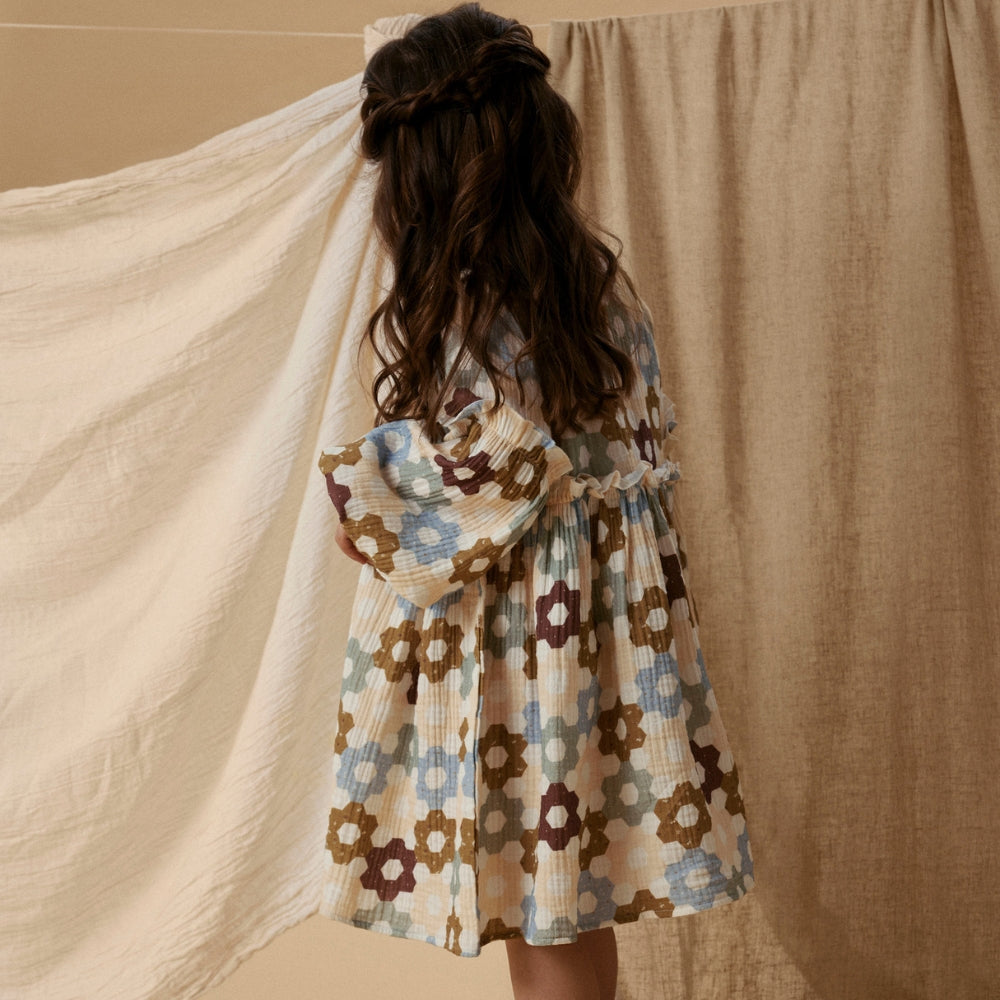 Questo abito per bambina di Lil' Atelier è la scelta perfetta per le giornate primaverili ed estive, quando leggerezza, libertà e comfort sono importanti.