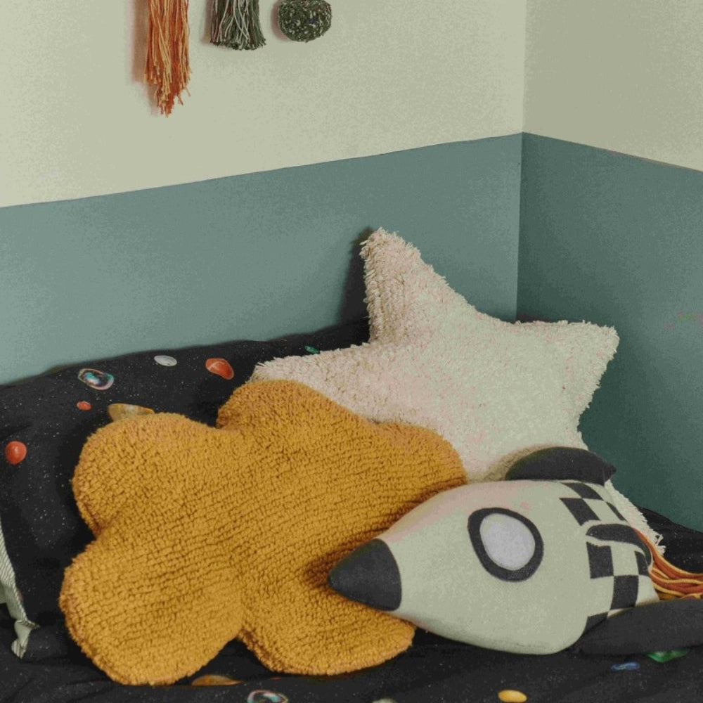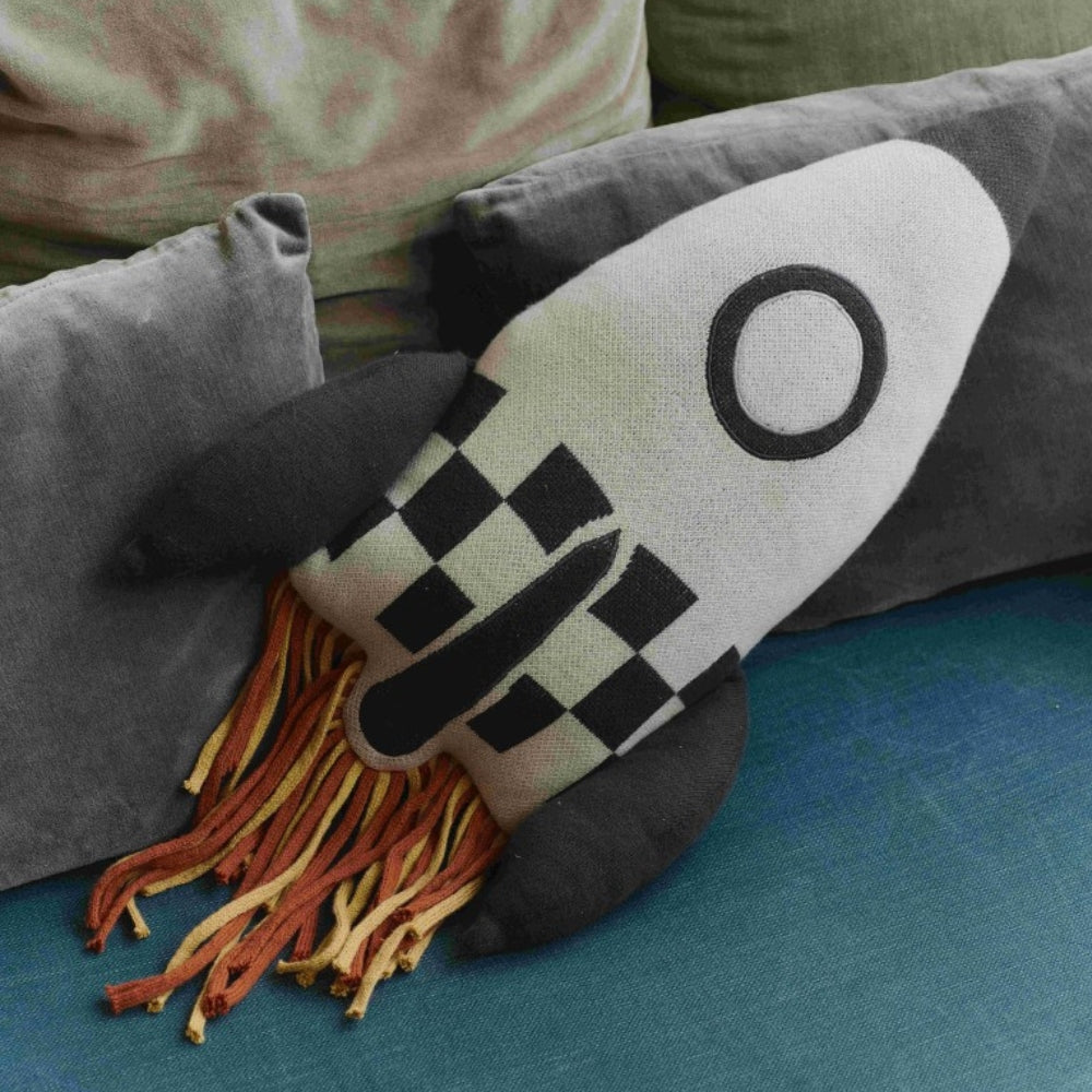 Il cuscino razzo di Lorena Canals è un accessorio morbido e fatto a mano che porta la magia cosmica nella stanza del bambino.