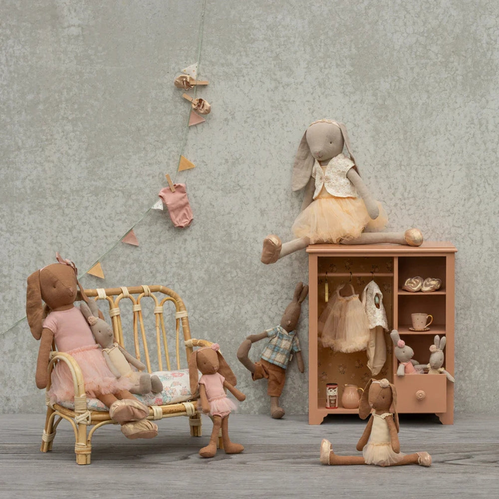 È il posto perfetto per i vestiti dei coniglietti, per gli orsacchiotti o per i tesori più preziosi del bambino. Grazie alle sue dimensioni, l'armadio in miniatura di Maileg è perfetto per la stanza di un bambino, pur essendo troppo grande per entrare nelle case delle bambole del marchio.