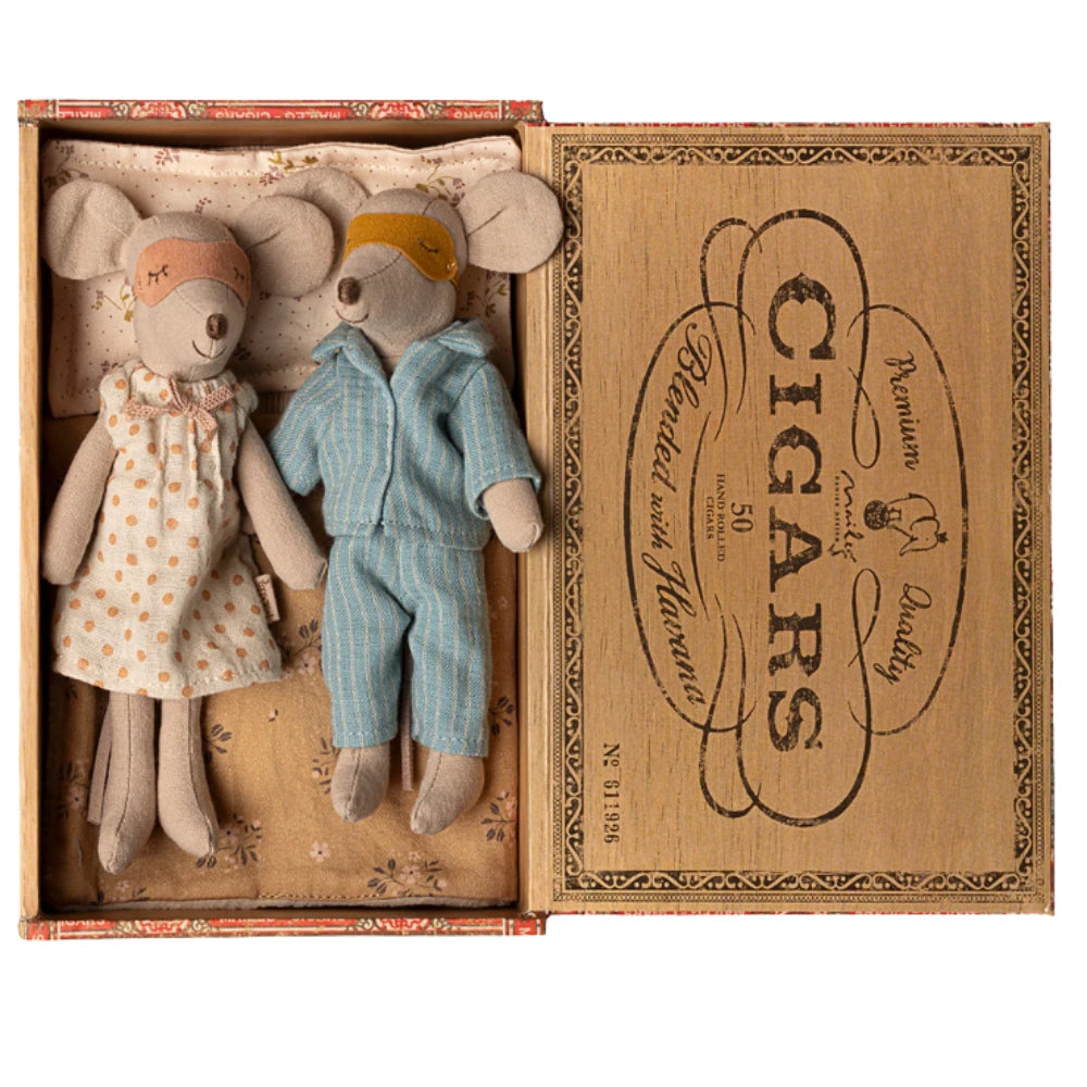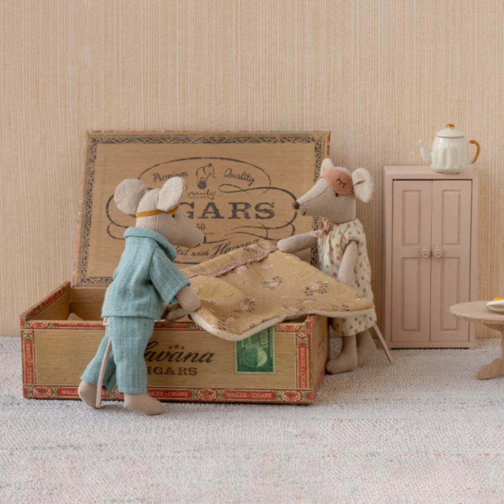 L'elegante scatola di sigari funge da letto dove i topolini possono riposare tranquillamente dopo una giornata di avventure.