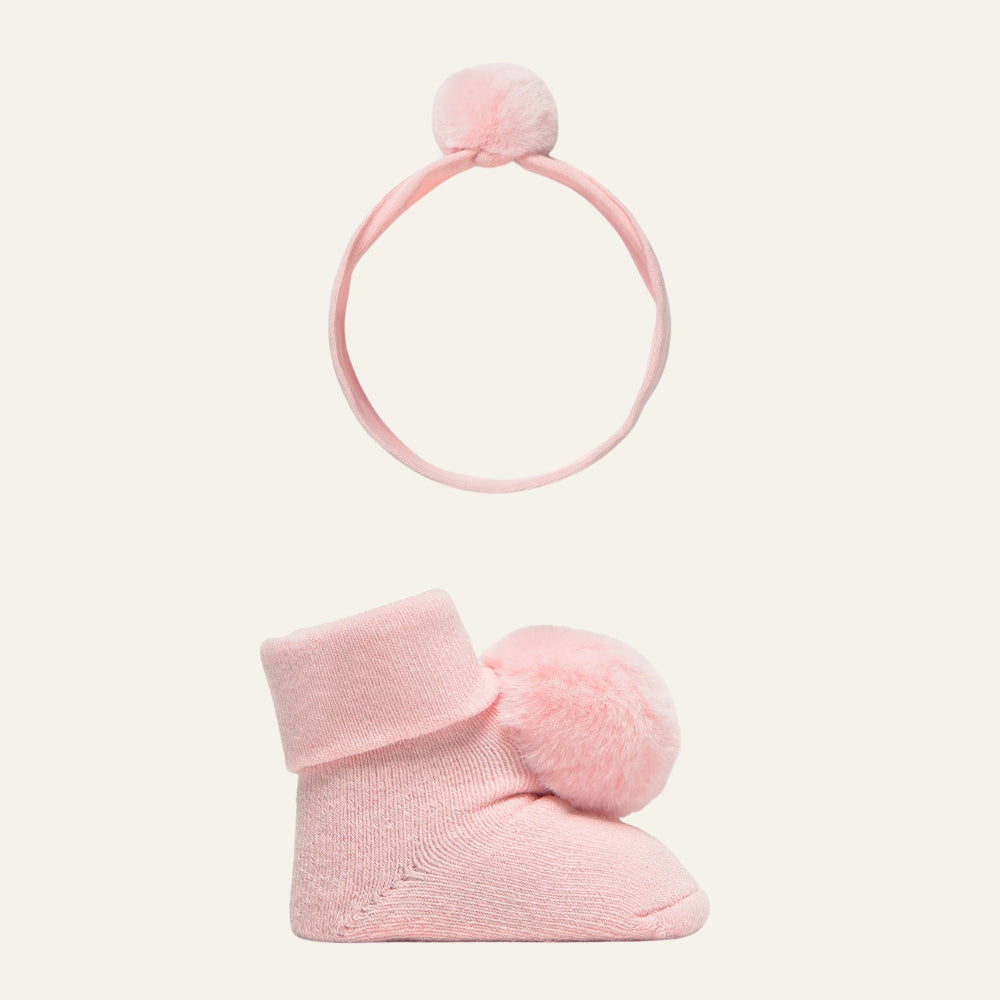 I calzini e la fascia per neonato sono caratterizzati da adorabili pompon e sottili rifiniture, che rendono il set adatto all'uso quotidiano così come alle occasioni speciali o alle foto di famiglia.