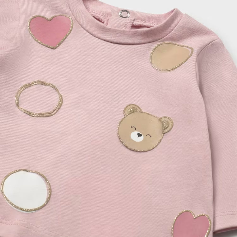 La maglietta per neonati a maniche lunghe colpisce per la delicata stampa con il motivo dell'orsacchiotto, che aggiunge un fascino infantile all'insieme.