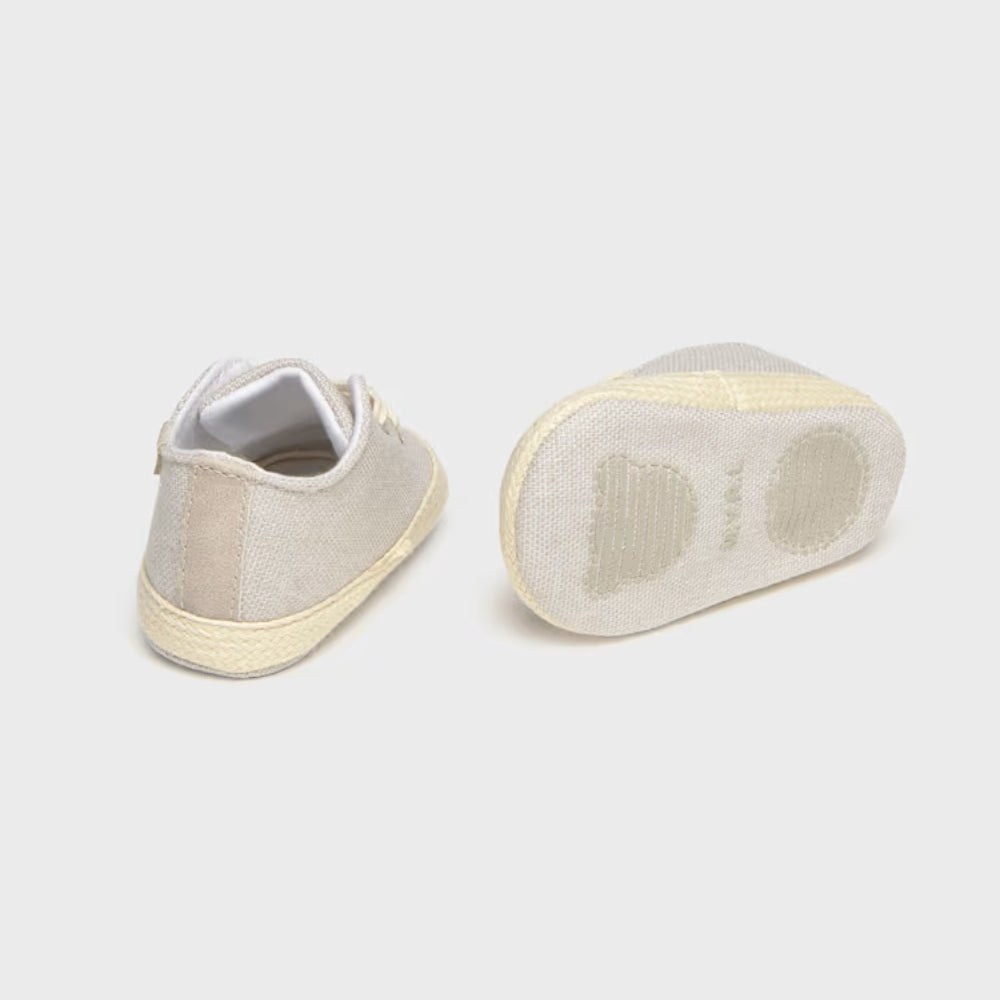 In un tenue colore beige, le scarpine da neonato sono perfette per le occasioni speciali come le feste di famiglia o i servizi fotografici.