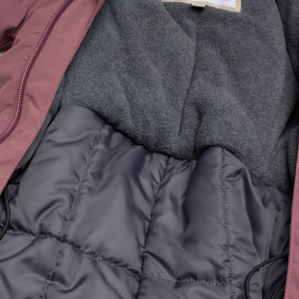 Una fodera in pile nel cappuccio, nella parte superiore e sui polsini fornisce ulteriore calore, mentre una fodera in taffetà scivoloso nelle maniche e nelle gambe lo rende facile da indossare.