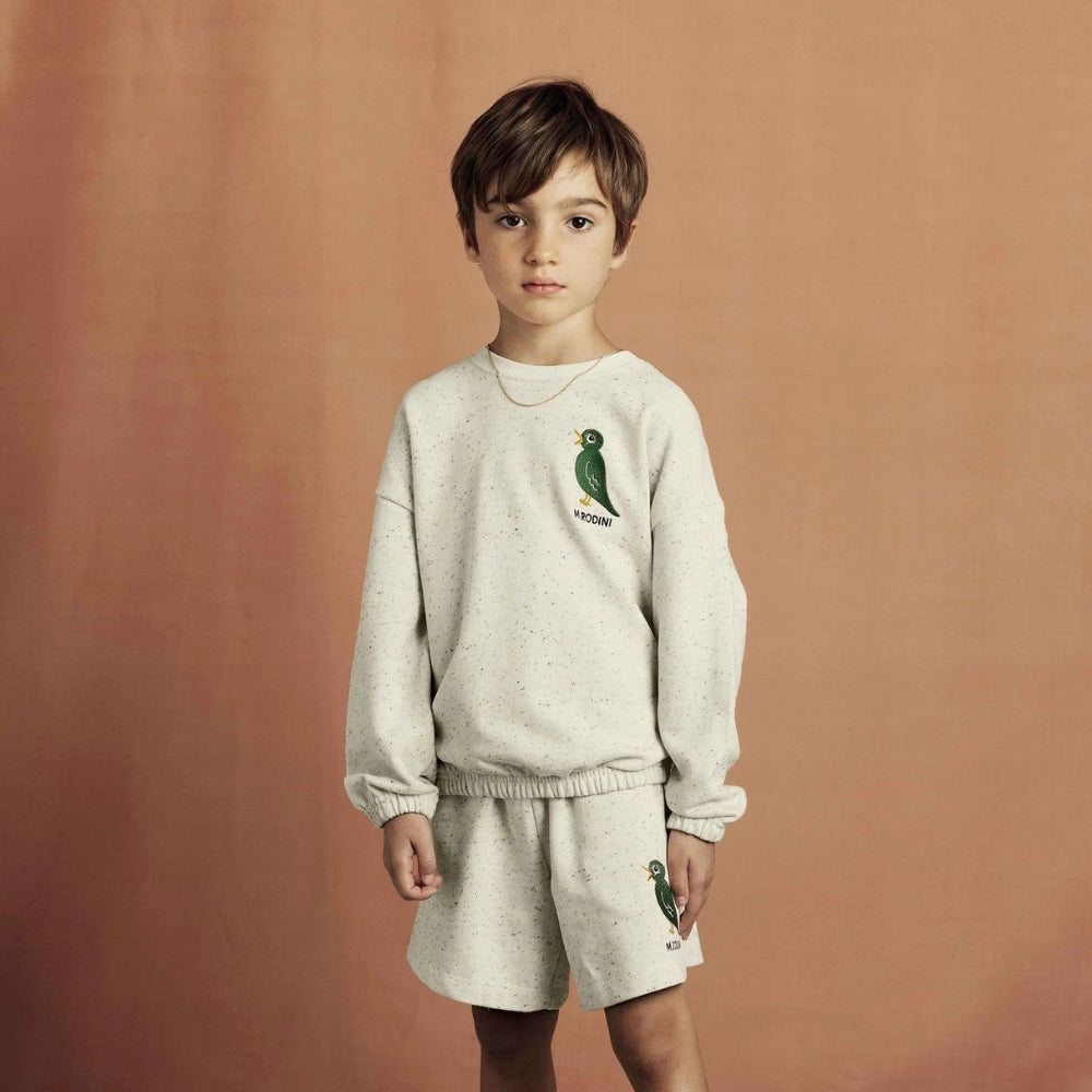 Il colletto a costine accentua lo stile casual della felpa, mentre la delicata toppa con uccellino ricamato sul petto è un dettaglio sottile ma distintivo, in linea con l'estetica del marchio Mini Rodini.