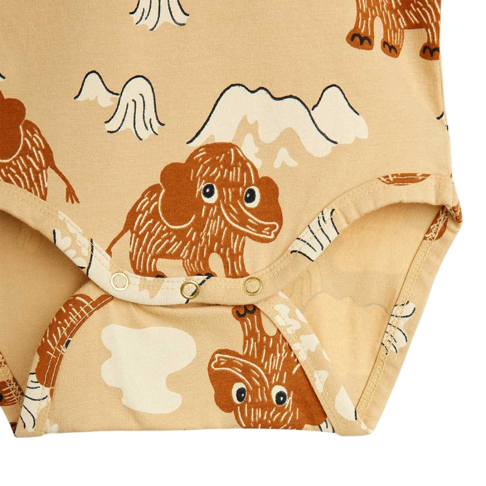 Il set comprende un body a maniche lunghe e un leggings, entrambi decorati con una divertente stampa all-over che raffigura simpatici mammut in un paesaggio montano.