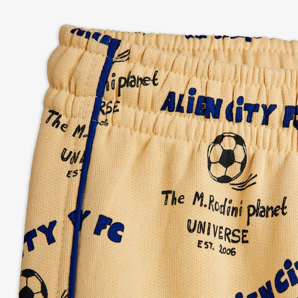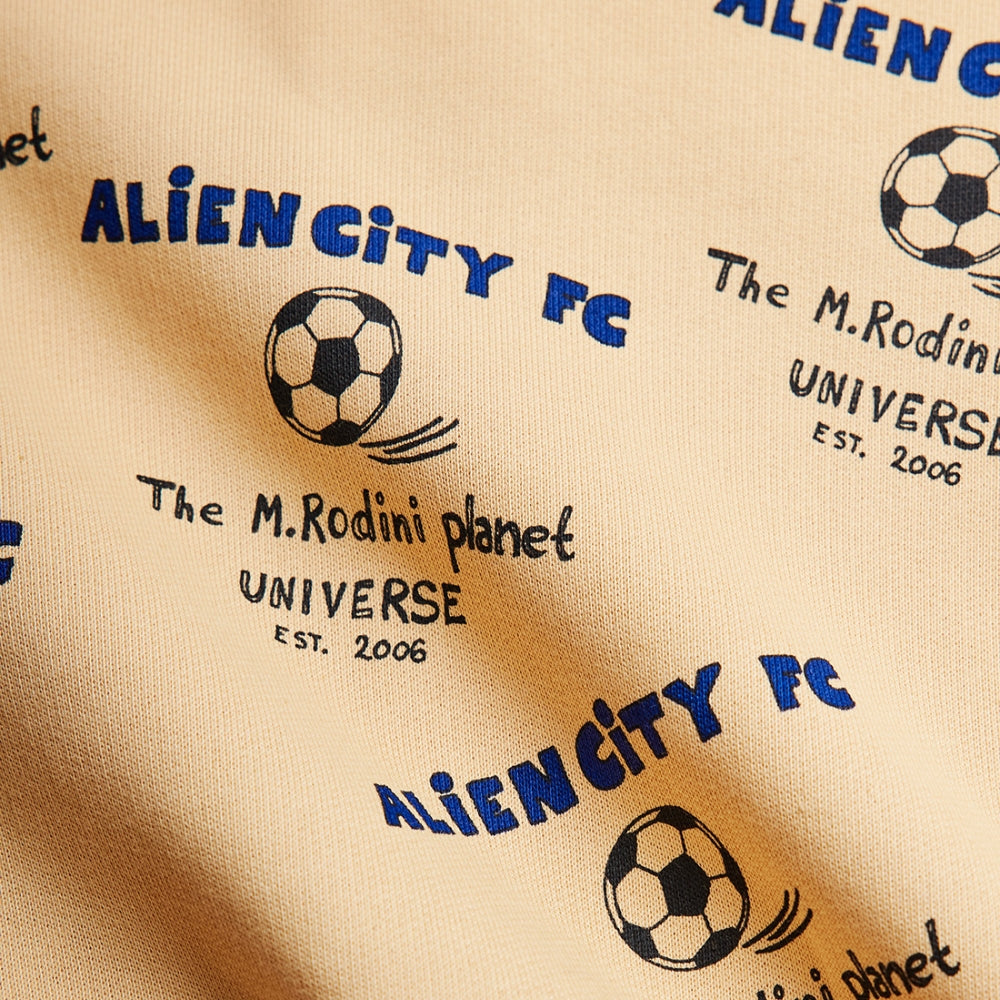 La base chiara in tonalità beige è ricoperta da una stampa blu e nera dell'Alien City FC con palloni e scritte, che conferisce all'insieme un'atmosfera sportiva e giocosa.