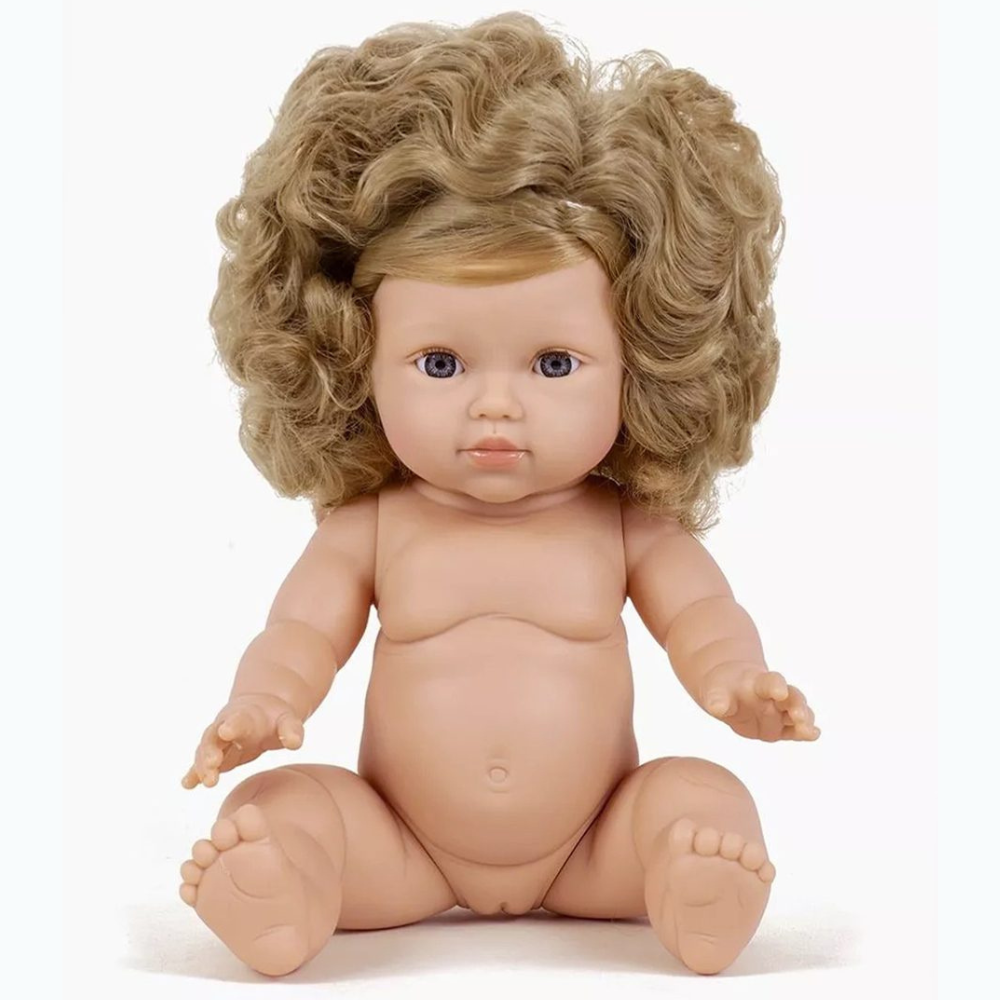 Lola è una classica bambola Minikane della collezione Gordis, con carnagione chiara, capelli biondi ondulati e occhi grigio-blu.