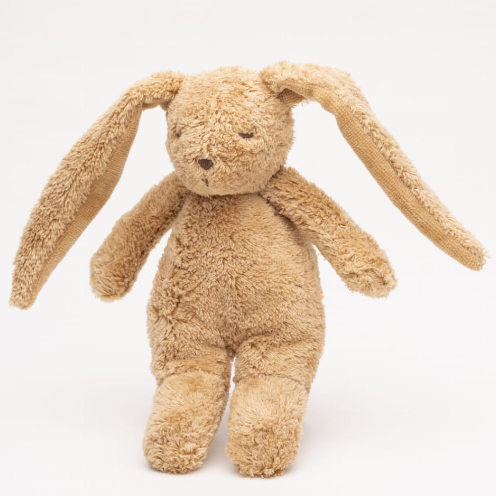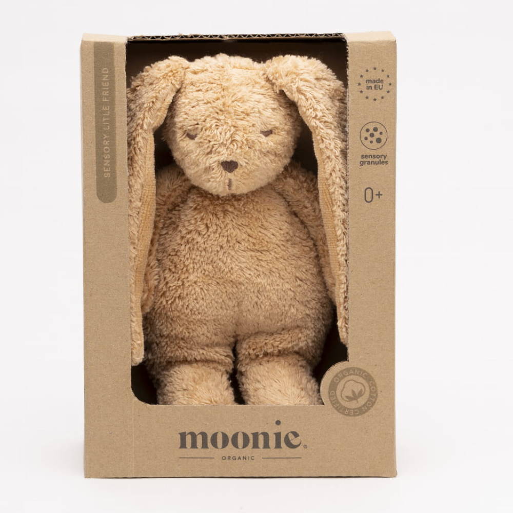 Il marchio Moonie ha utilizzato materiali sicuri e tattili - cotone organico e morbida imbottitura - in modo che il giocattolo sia adatto anche alla pelle sensibile dei bambini.