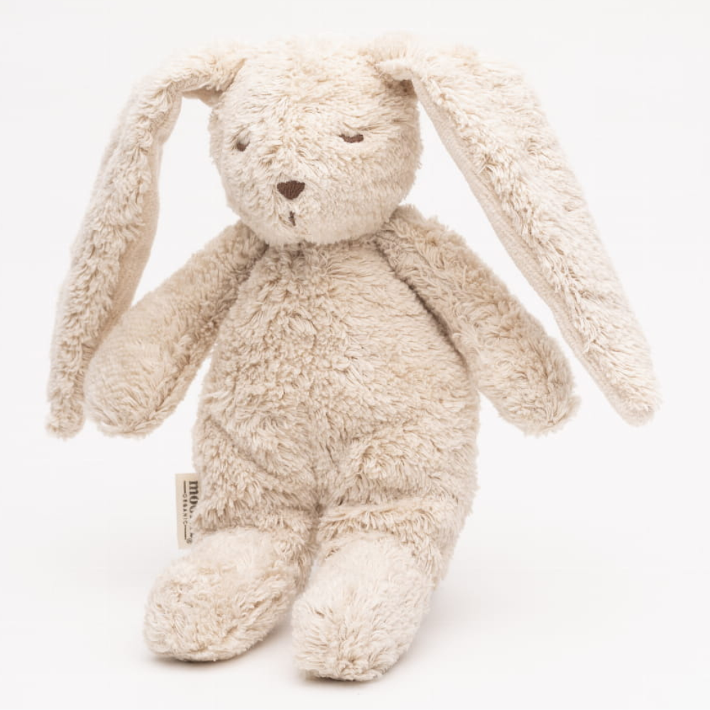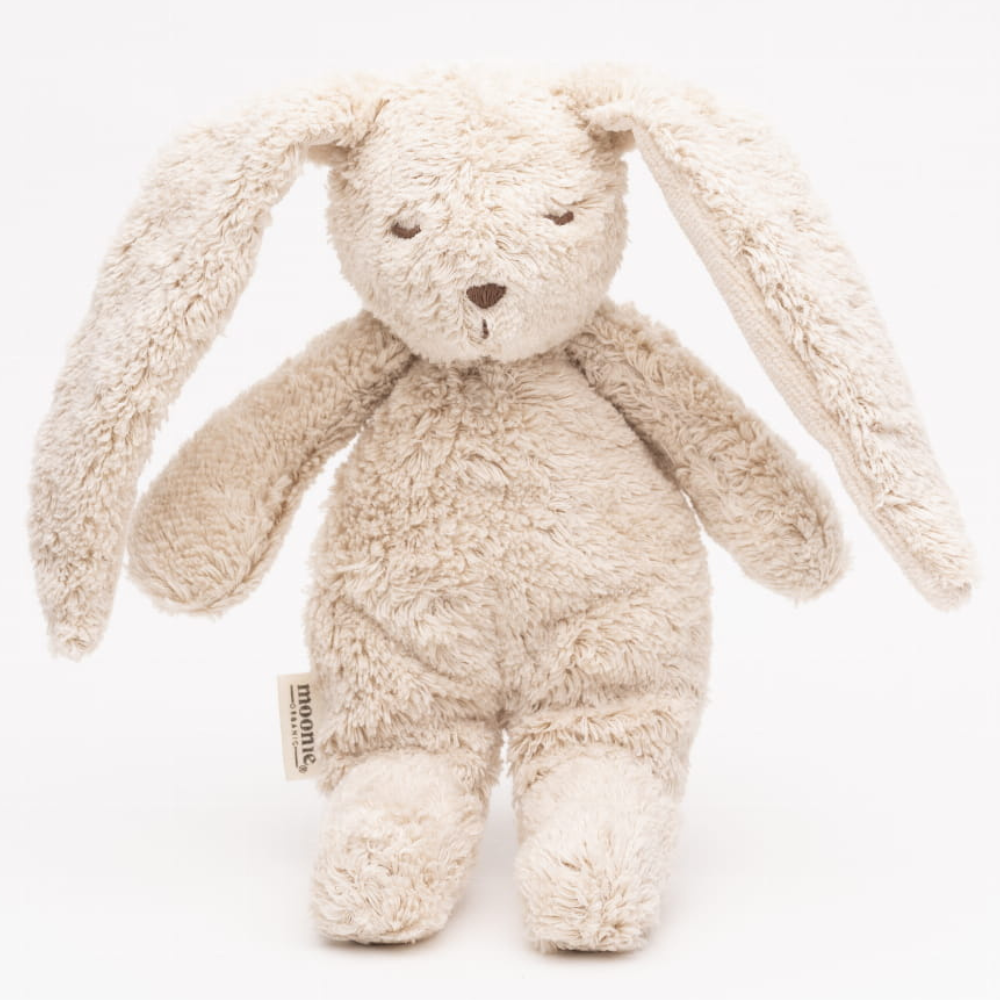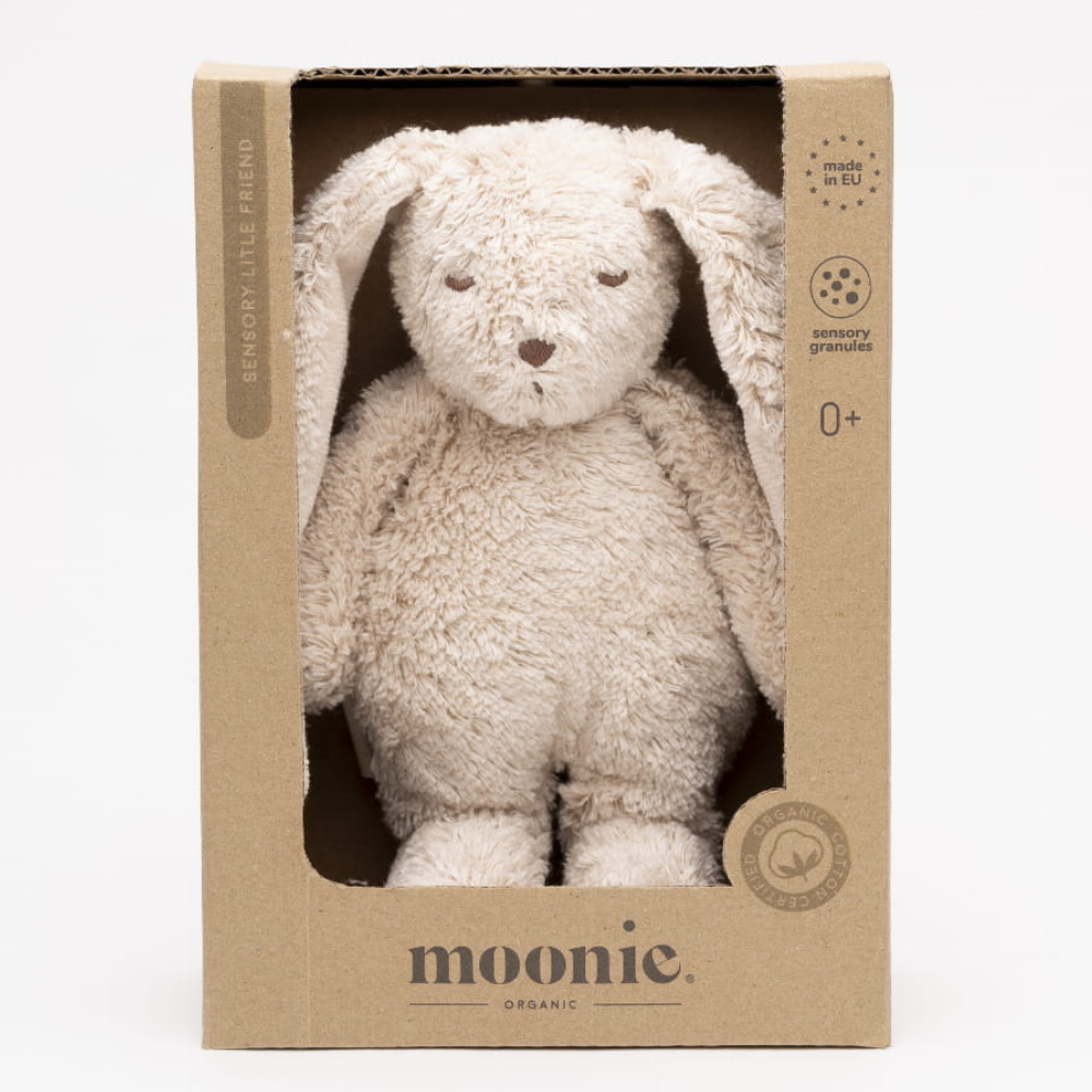 Il marchio Moonie ha utilizzato materiali sicuri e tattili, come il cotone biologico e la morbida imbottitura, in modo che il giocattolo sia adatto anche alla pelle sensibile dei bambini.