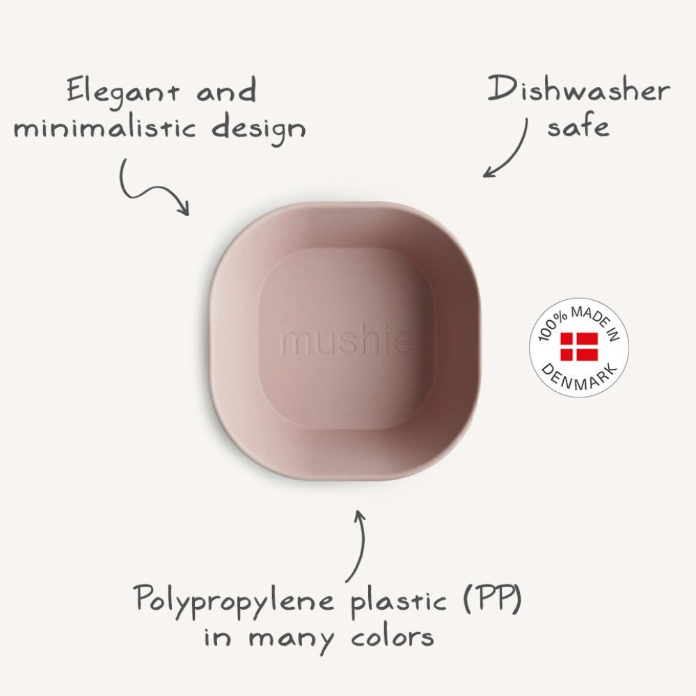 Le due ciotole quadrate per bambini di Mushie sono pensate per i primi pasti indipendenti del bambino.