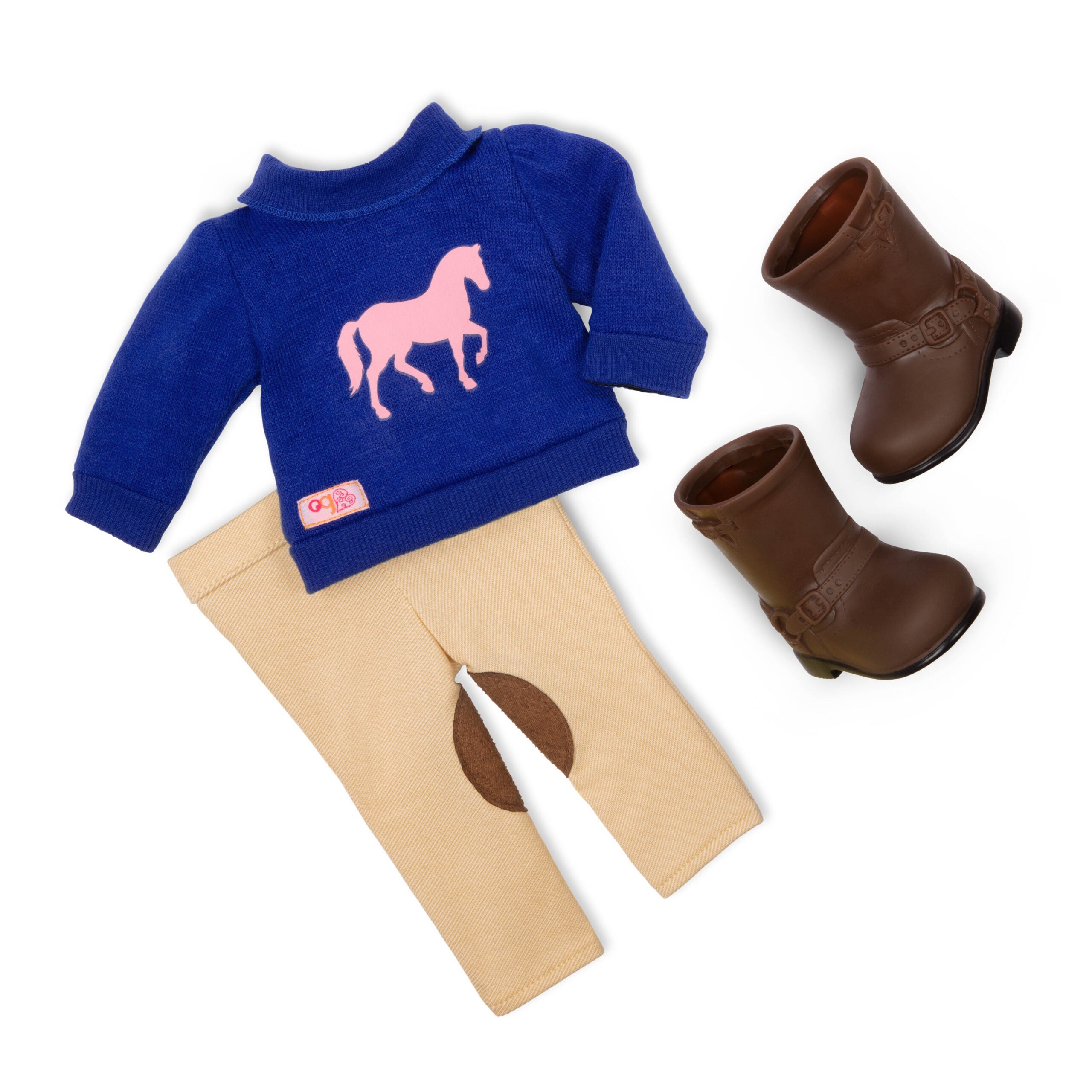 - Il set comprende: bambola, maglione a collo alto con motivo di cavalli, pantaloni da equitazione, biancheria intima e stivali da equitazione.