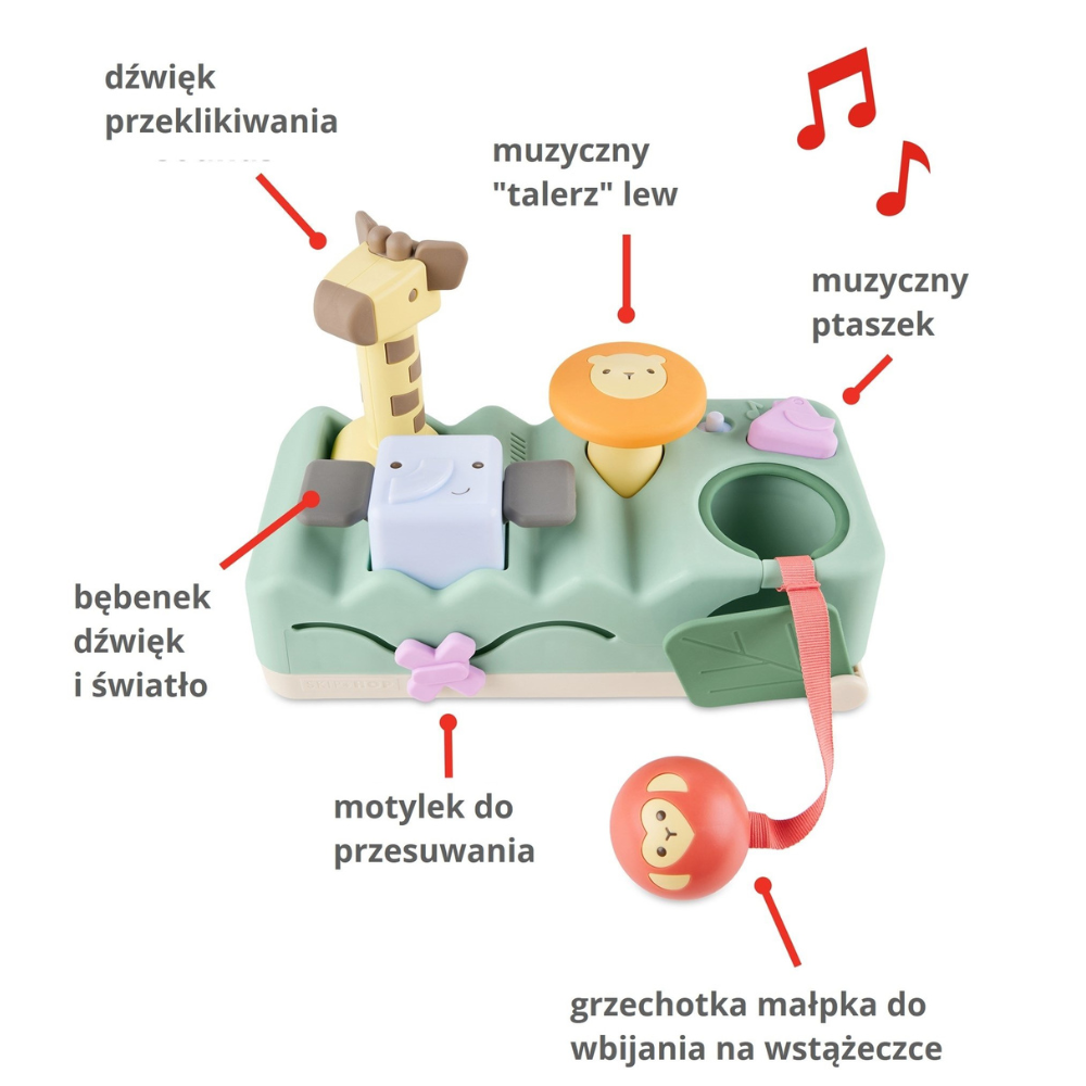 Il giocattolo musicale e picchiettante include un piccolo martello a forma di giraffa con orecchie e naso morbidi, un disco illuminato a forma di leone, un tamburo bongo a forma di elefante, un uccellino musicale, un sonaglio a forma di scimmia, una foglia a nascondino, un cursore a farfalla e 12 suoni di animali, canzoni, suoni di tamburi e piatti.