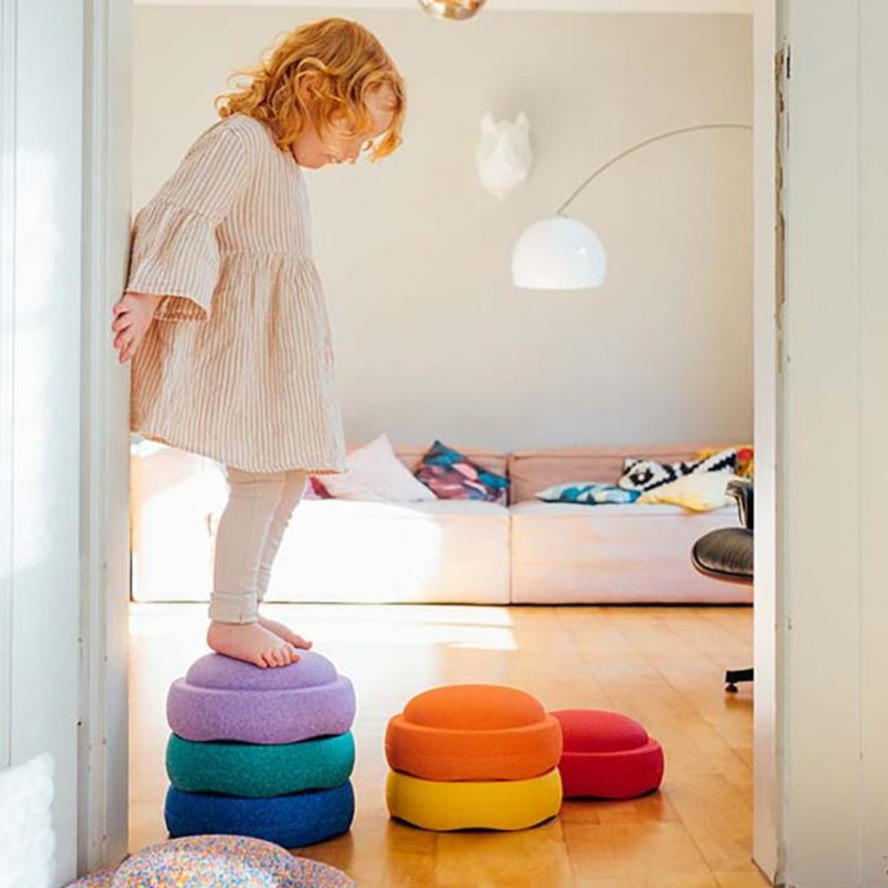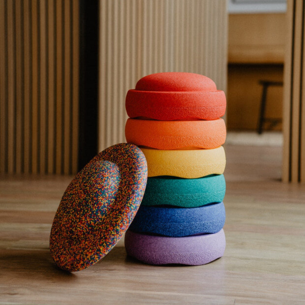 Das Stapelstein Bewegungsspielzeug Regenbogenset klassische Balancierscheibe ist ideal zum Üben von Gleichgewicht und dynamischem Sitzen.