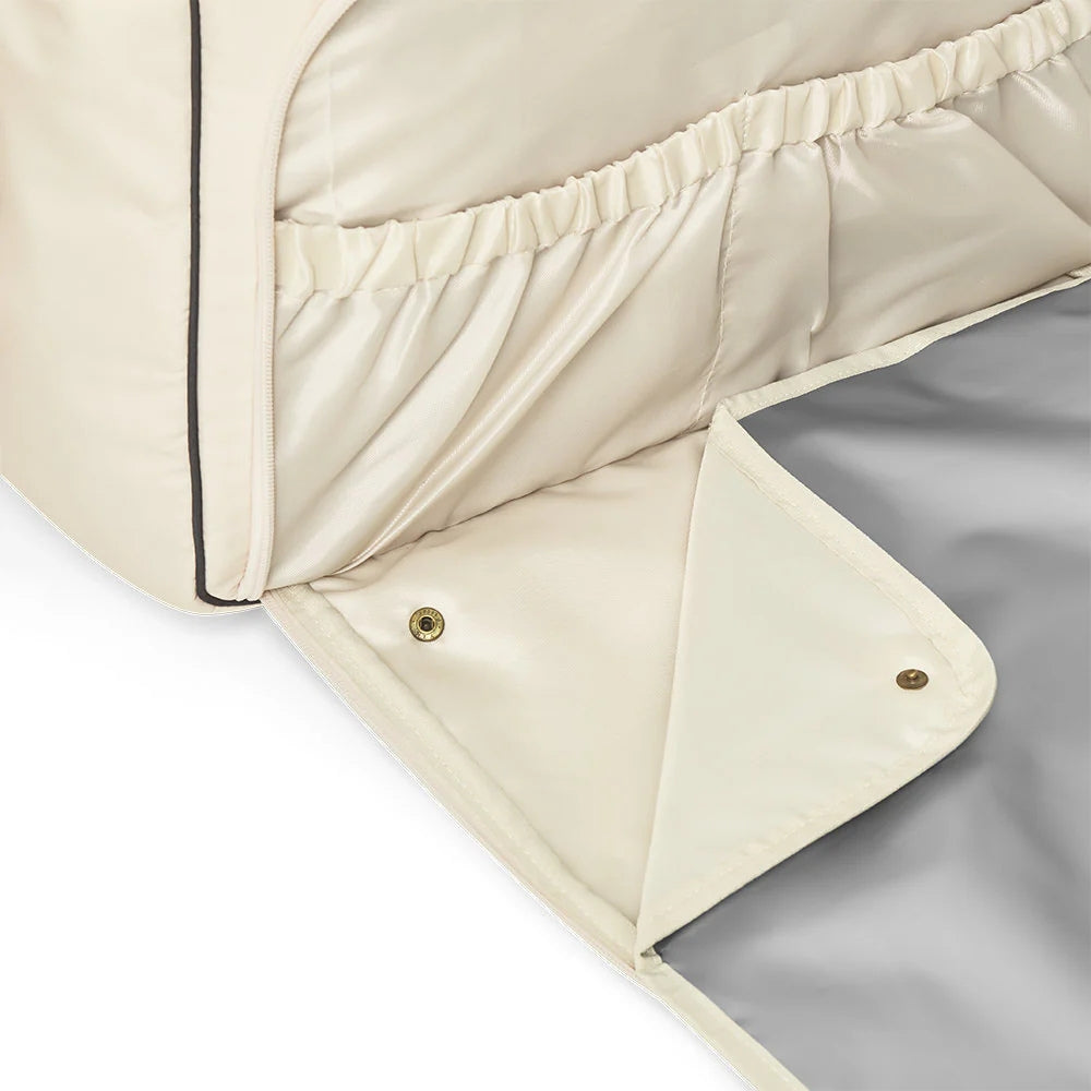 È dotata anche di un fasciatoio, alloggiato in un'ampia tasca esterna che può essere facilmente staccata e rimossa, lasciando spazio extra per altri oggetti. L'interno della borsa è dotato di ampi scomparti, tra cui una doppia tasca con rivestimento termico, ideale per conservare biberon di latte o bevande.