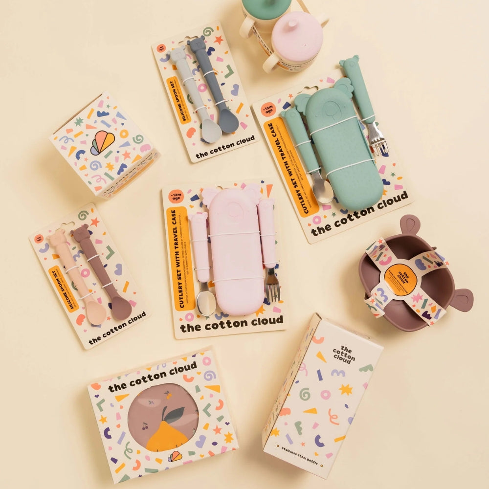 Le posate per bambini Cotton Cloud del set Zoe the Koala rendono l'apprendimento del cibo indipendente un vero piacere per il bambino.