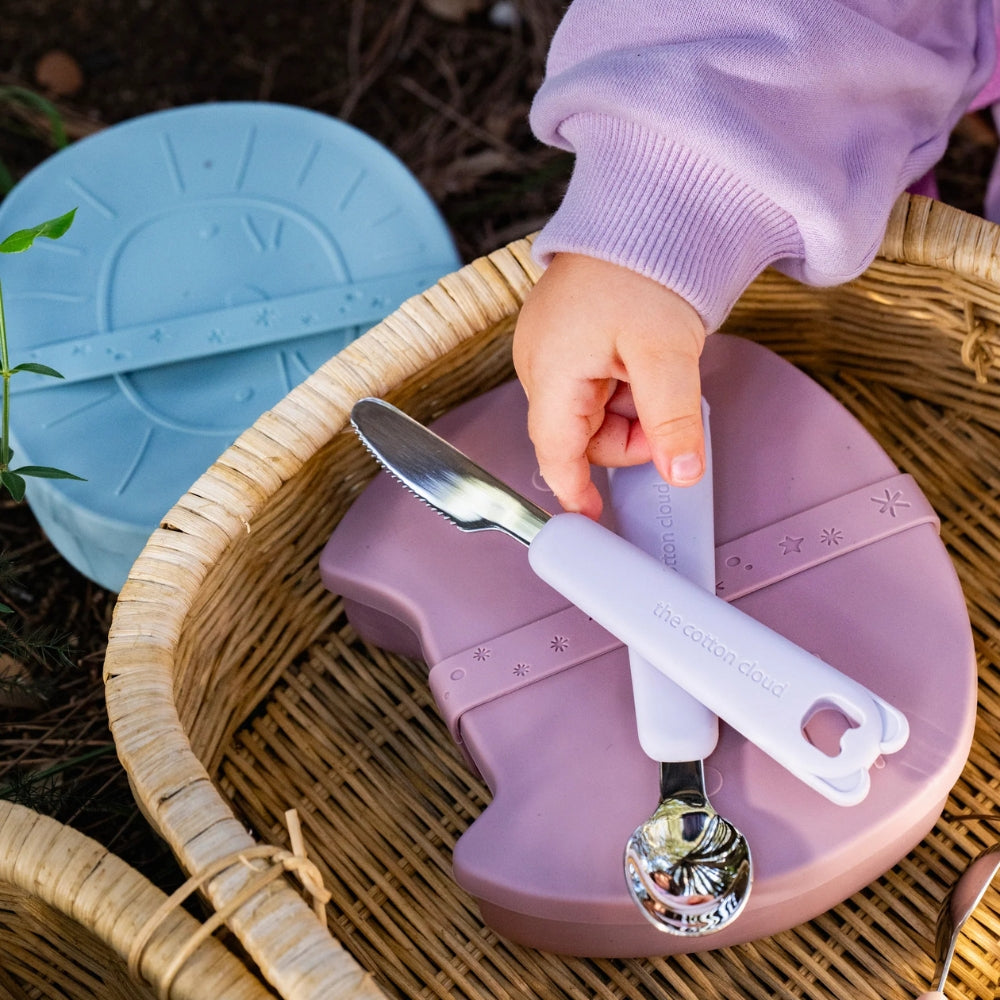 Cotton Cloud ha pensato anche all'aspetto pratico: è incluso un coperchio in silicone che consente di riporre le posate del bambino in modo igienico sia a casa che in viaggio.