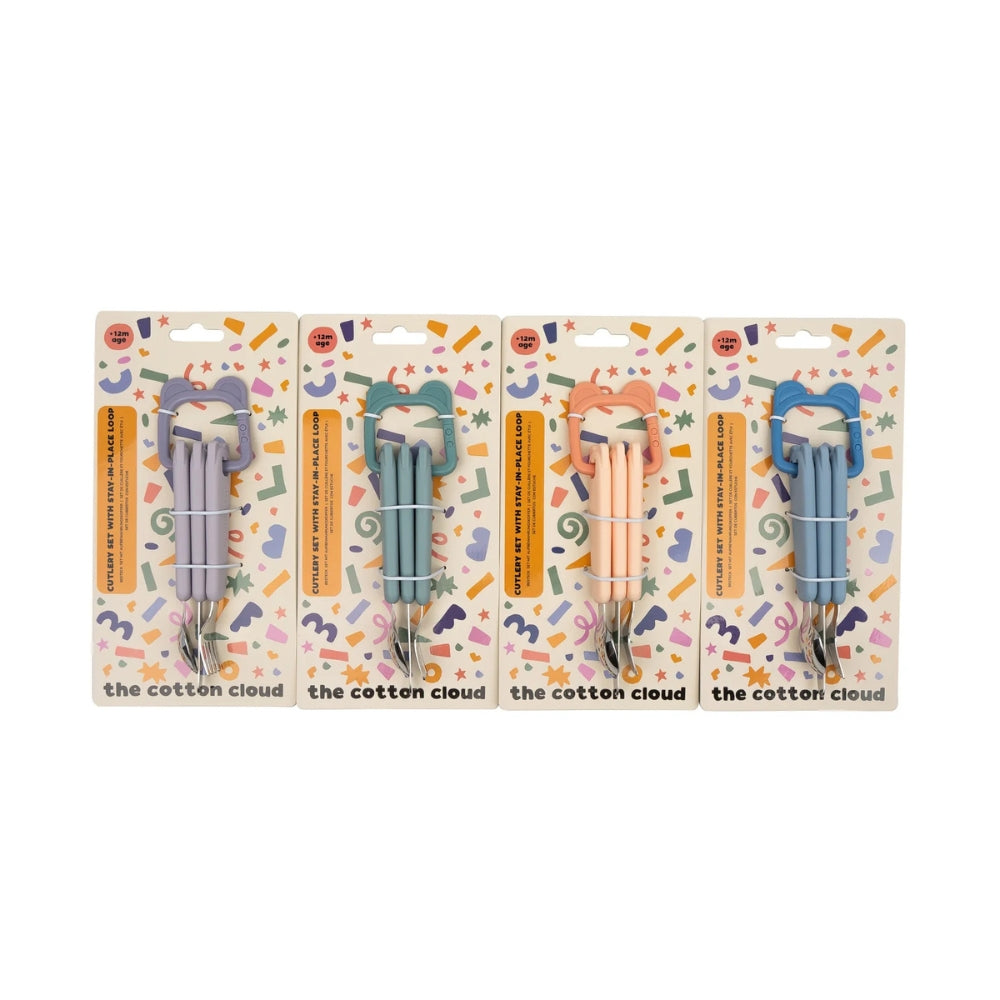 Le posate per bambini Cotton Cloud sono un pratico set per ogni pasto fuori casa.