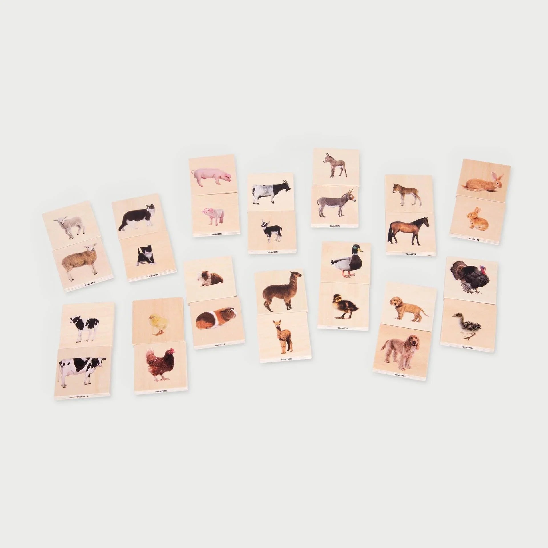 I puzzle per bambini TickiT sono costituiti da 14 coppie di puzzle quadrati di animali in legno, lisci e tattili.