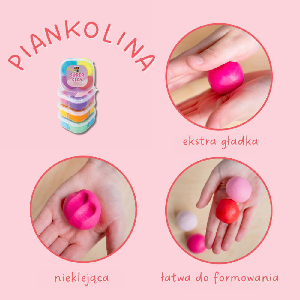 In un'unica scatola, il bambino troverà tutto il necessario per modellare le proprie figure con il composto leggero che si asciuga all'aria, per poi giocare con loro sul colorato palcoscenico incluso.