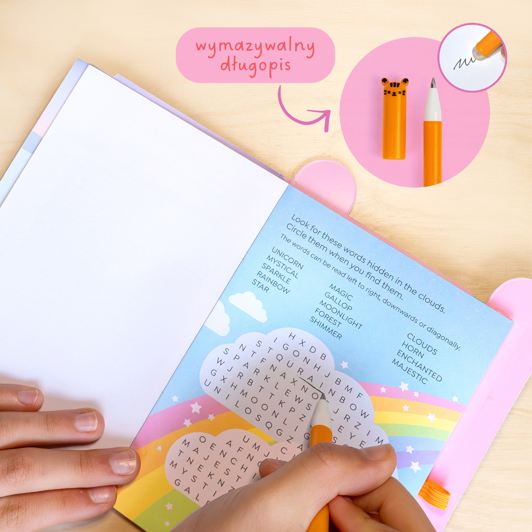 All'interno, 25 pagine di attività: labirinti, puzzle, giochi di parole e di logica, oltre a un foglio di adesivi e a un pennarello cancellabile per ripetere ogni attività a piacimento.