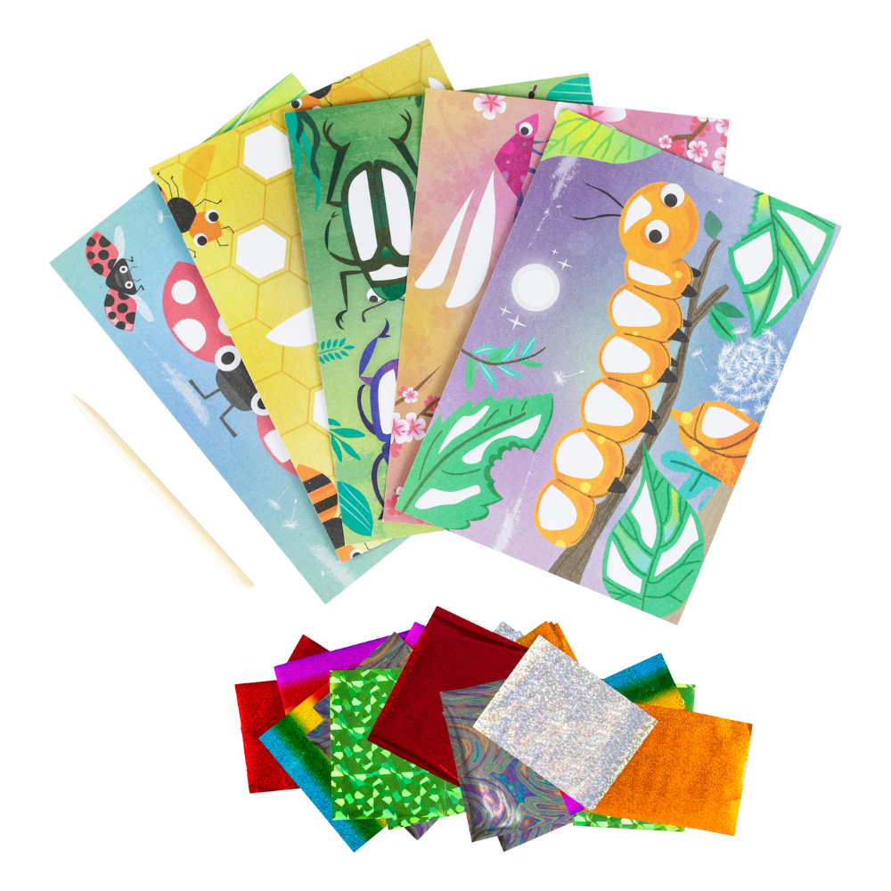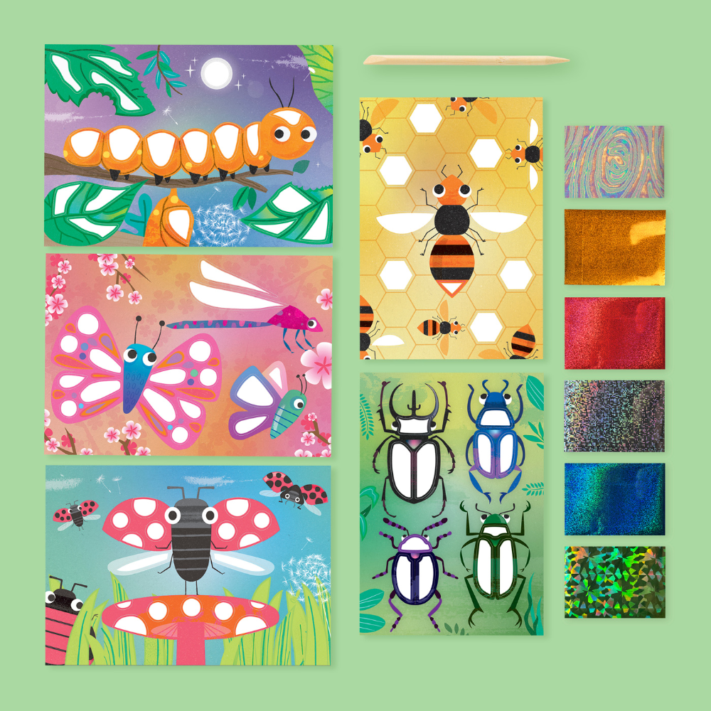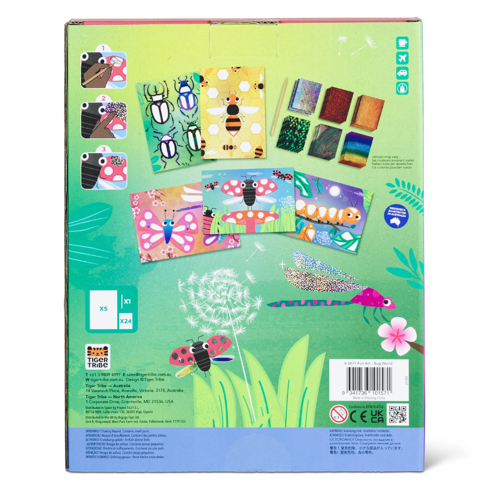 Tiger Tribe Art Set with Foil - Joyful Bugs è un giocattolo creativo che attira i bambini nel favoloso mondo luccicante di coleotteri, api e coccinelle. Basta scegliere un'illustrazione, staccare le caselle bianche e applicare la lamina olografica: l'immagine prende immediatamente vita, perfetta da appendere con orgoglio alla parete della stanza del bambino.