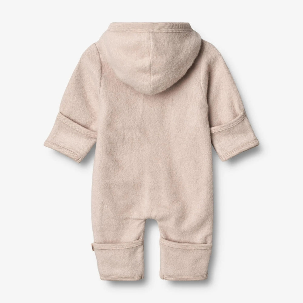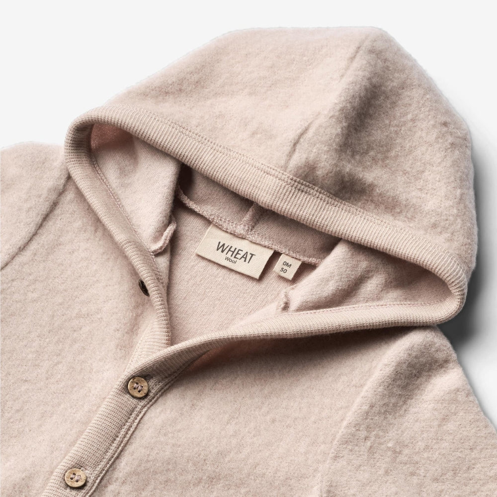 La tutina Wheat in lana merino è la scelta perfetta per le giornate più fredde. Grazie a una morbida miscela di lana merino infeltrita e cotone biologico, il capo è piacevole al tatto e mantiene il bambino caldo e comodo.